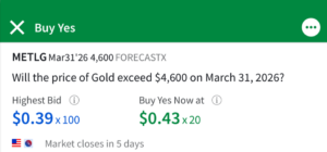 This trade represents a clear probability bet. At $0.40, the market is implying roughly a 40% chance that gold will exceed $4,600 by the specified date.